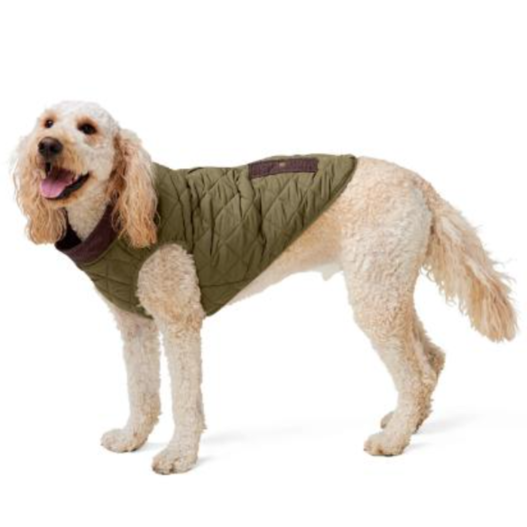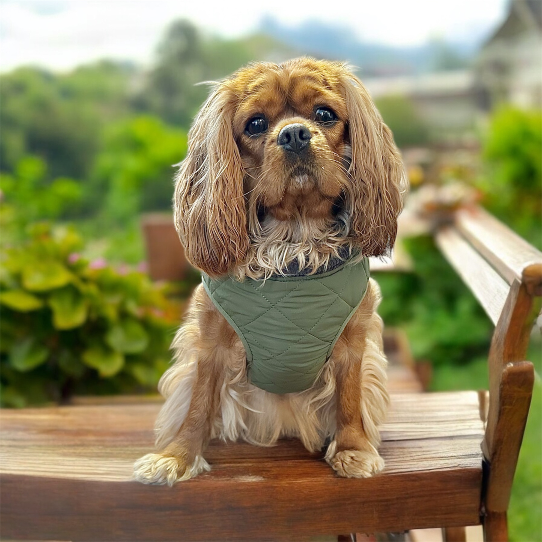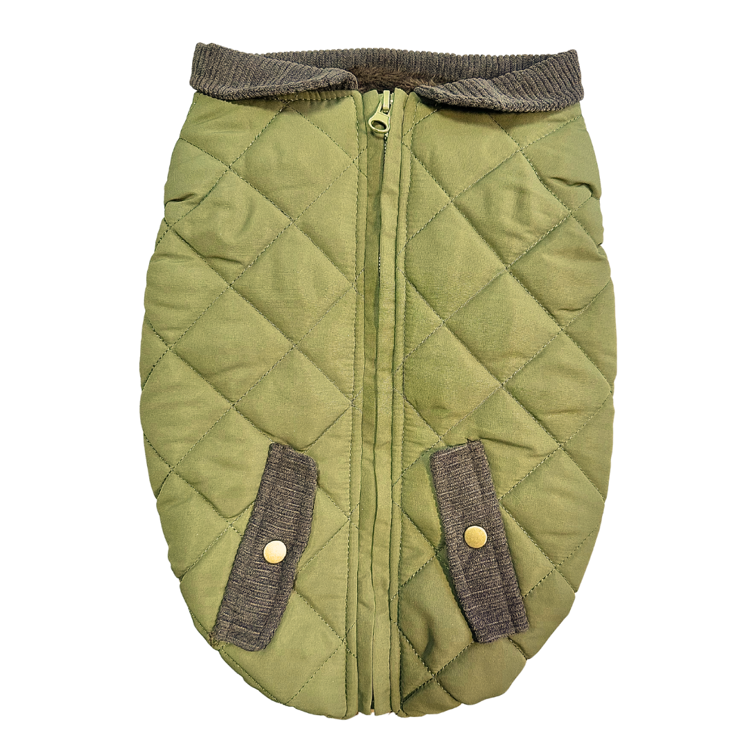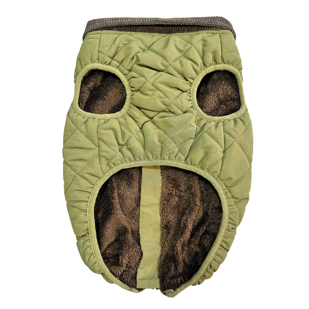 Keep your pup warm and fashionable with a quilted body, soft teddy lining, corduroy trim, and brass button details. Designed for comfort with a leash hole for easy walks!