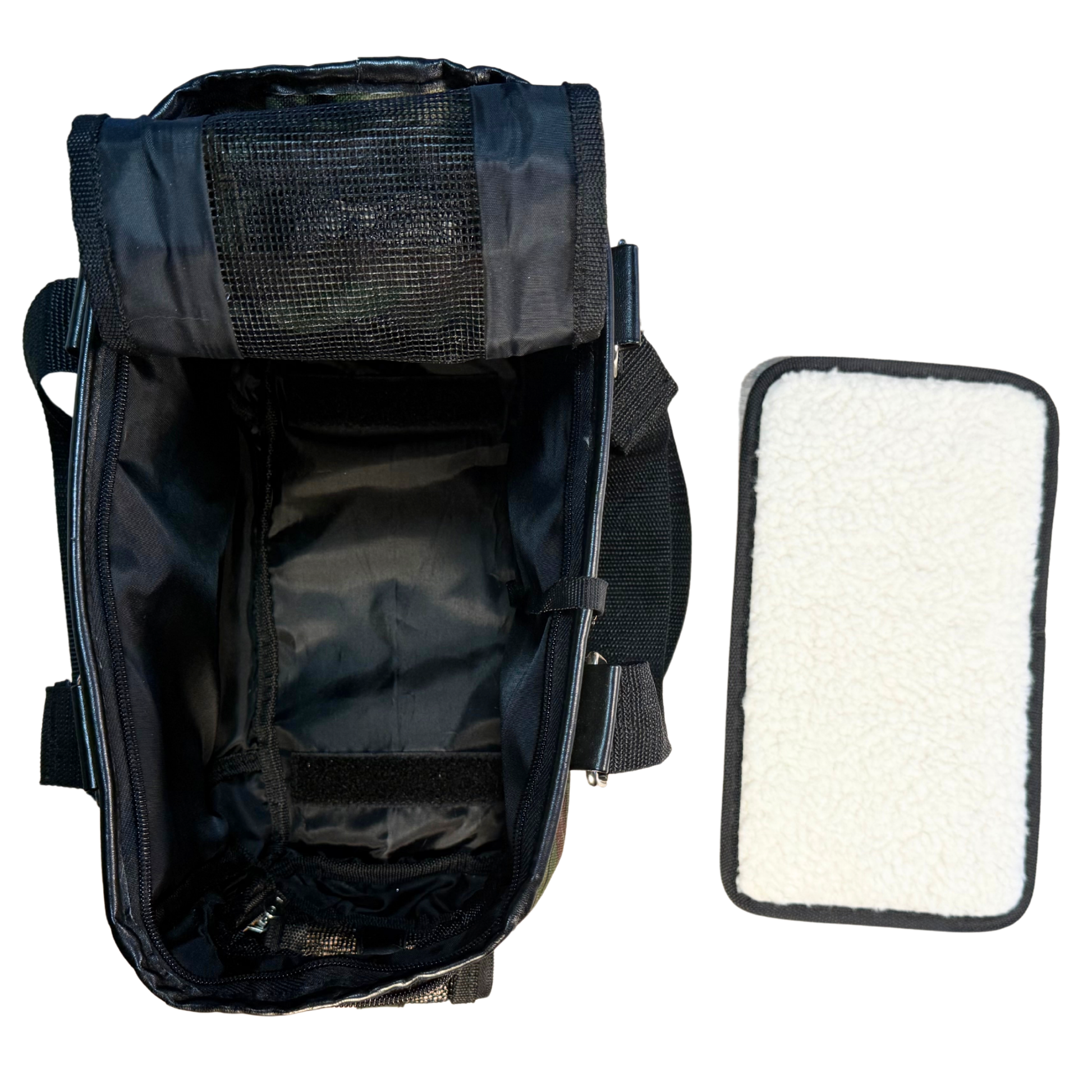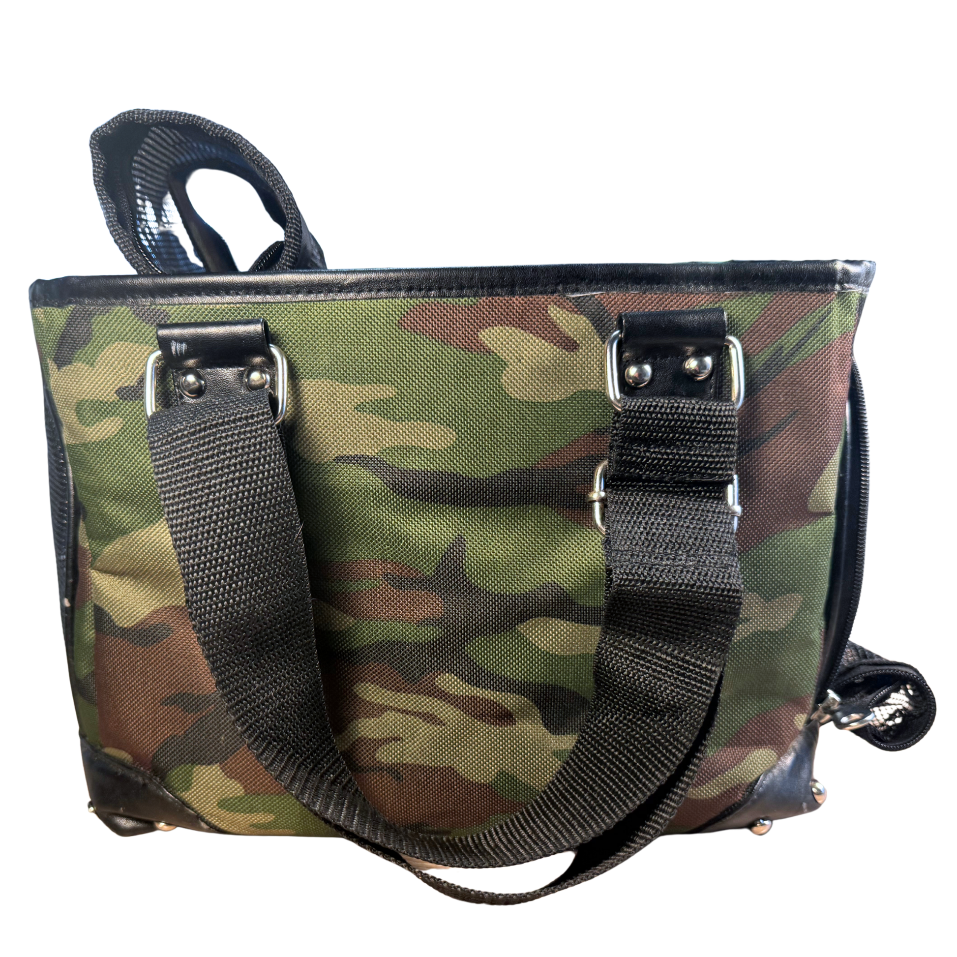 Durable and lightweight pet carrier with camouflage fabric, mesh ventilation, reinforced base with metal feet, secure zippered openings, and both shoulder and top handles for easy, comfortable carrying and cleaning.