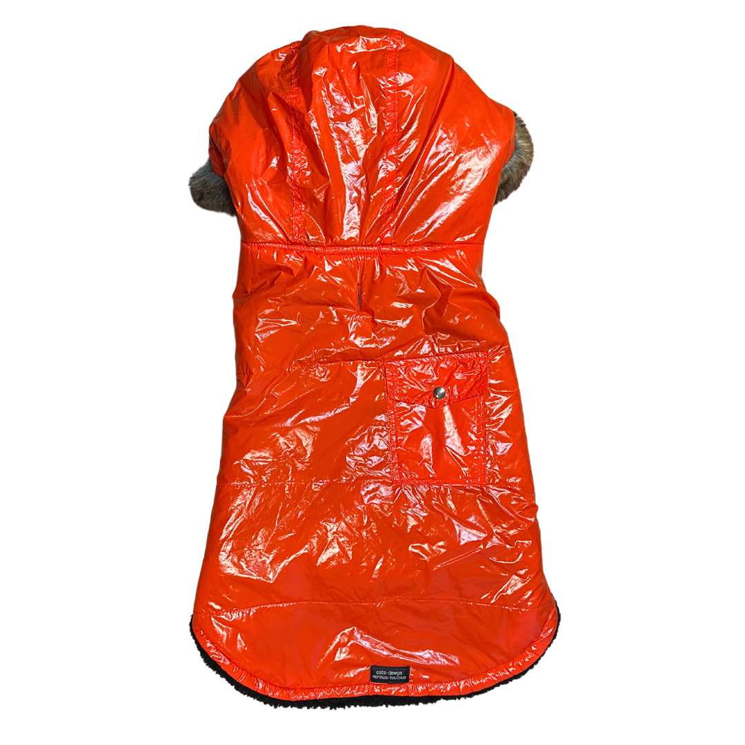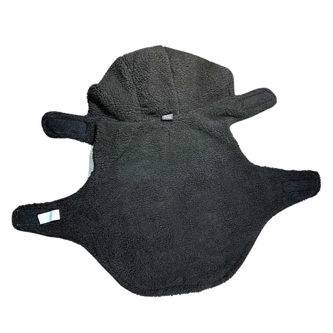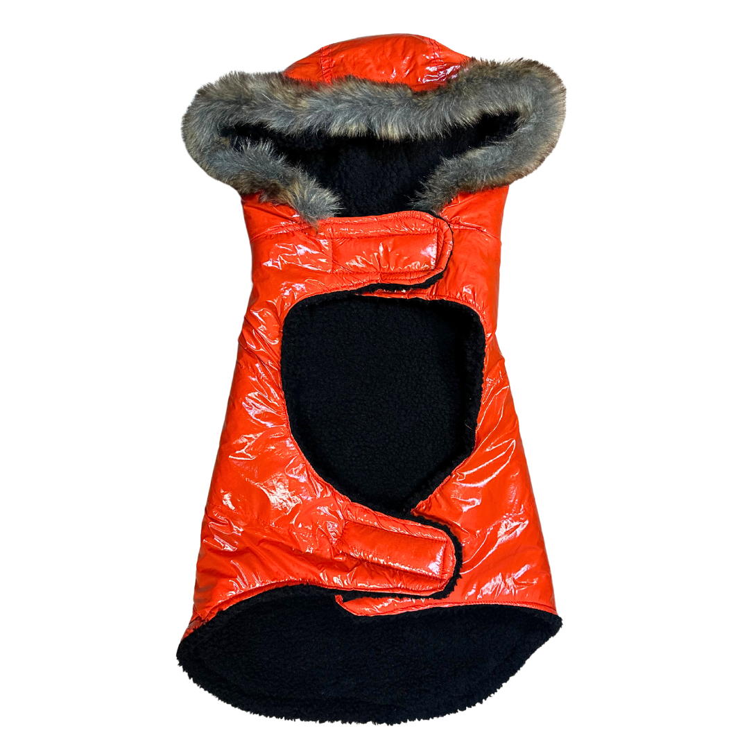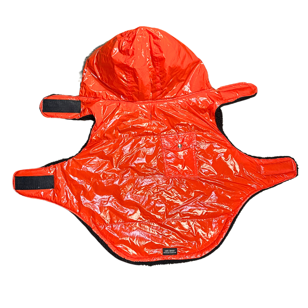 Key Features: Warm fleece lining, Faux fur hood, Pocket for treat and bag storage, Easy wrap-around design (no stepping in required), Leash / harness slit, Size-adjustable velcro, Machine washable.