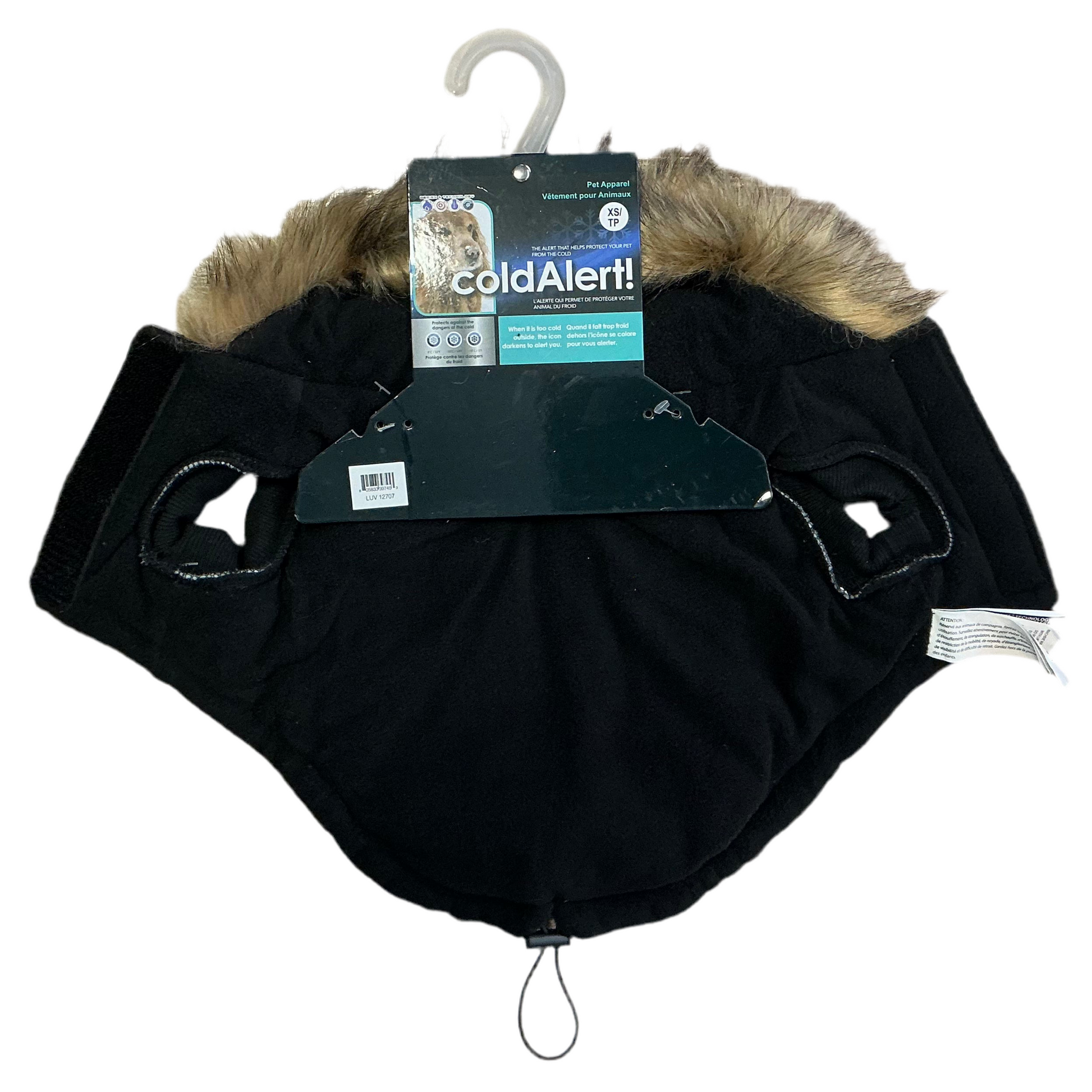 Warm fleece-lined coat with faux-fur hood and reflective details. Great for cold weather walks. Best for Chihuahua, Yorkies, Mini Dachshund.