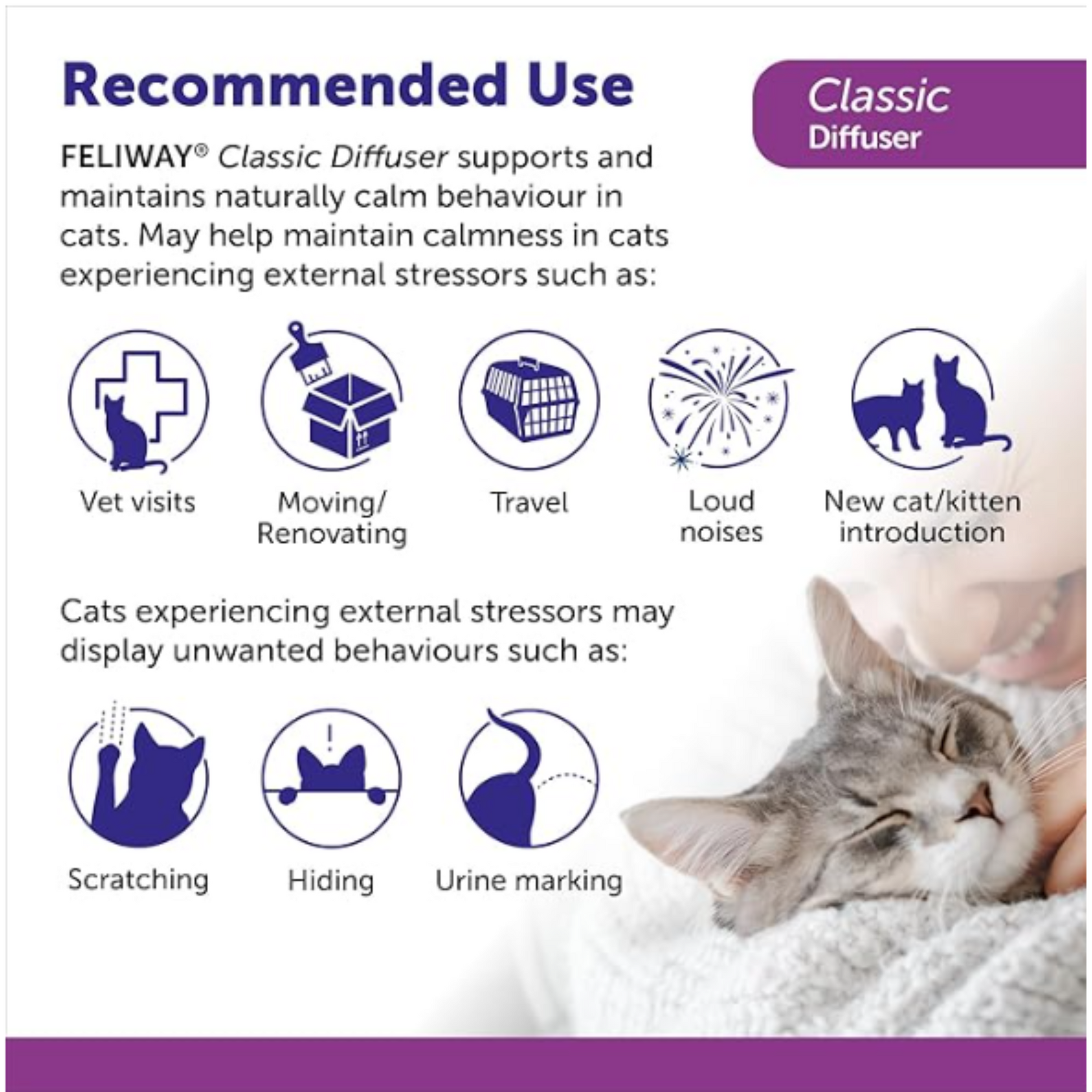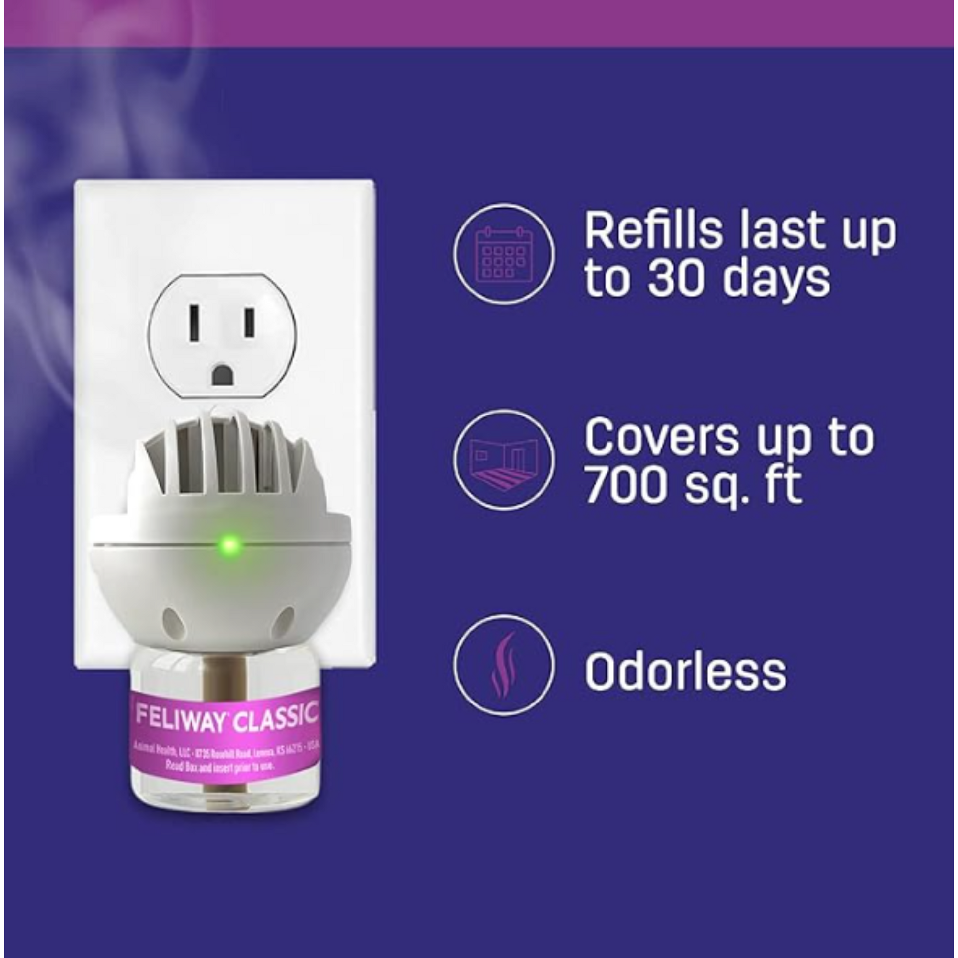 FELIWAY CLASSIC is a vet-recommended, drug-free pheromone diffuser designed to comfort and reassure cats at home. Clinically proven to help 9 out of 10 cats, it reduces stress-related behaviors such as urine spraying, scratching, and hiding, especially during environmental changes. Easy to use, it plugs into an open area and covers up to 700 square feet. The diffuser should remain plugged in continuously and refills last about 30 days, with the device itself needing replacement every six months. FELIWAY is scentless, safe for humans and other pets, and has been trusted by veterinarians and cat owners for over 25 years, helping more than 14 million cats worldwide. For households with fighting cats, FELIWAY FRIENDS is recommended to promote harmony, while FELIWAY CLASSIC remains the preferred choice when introducing a new cat.