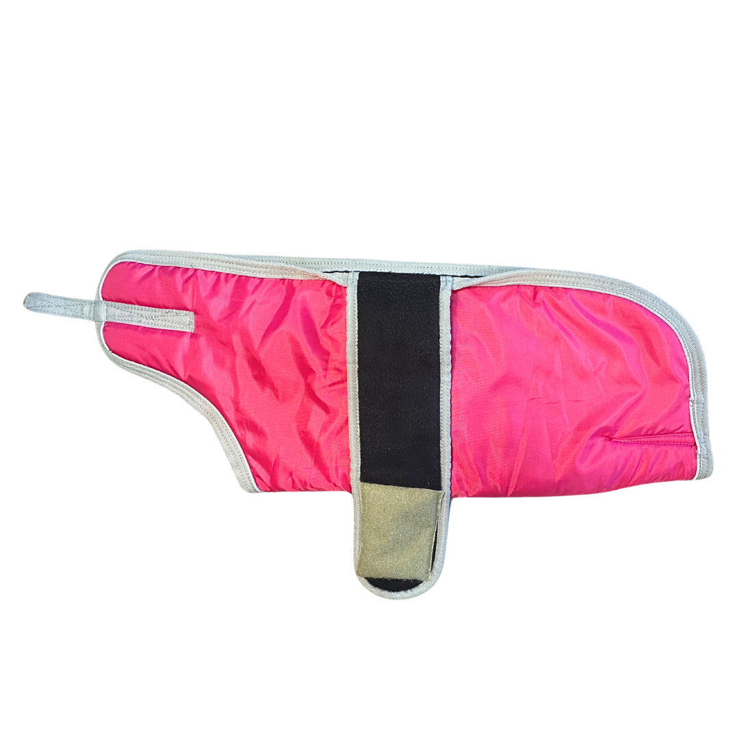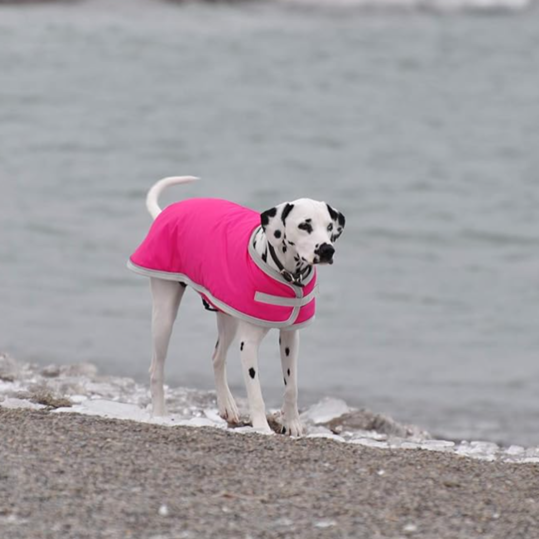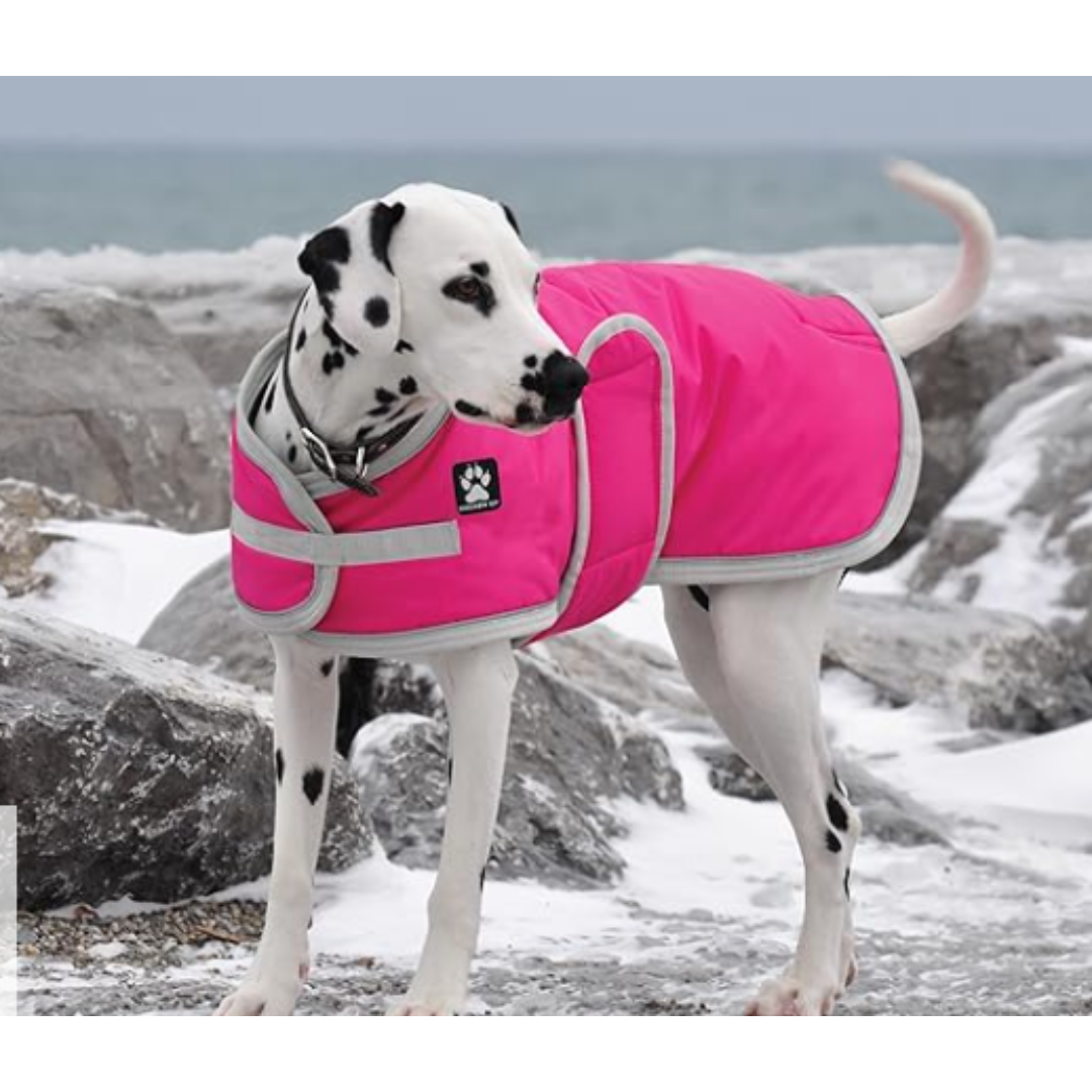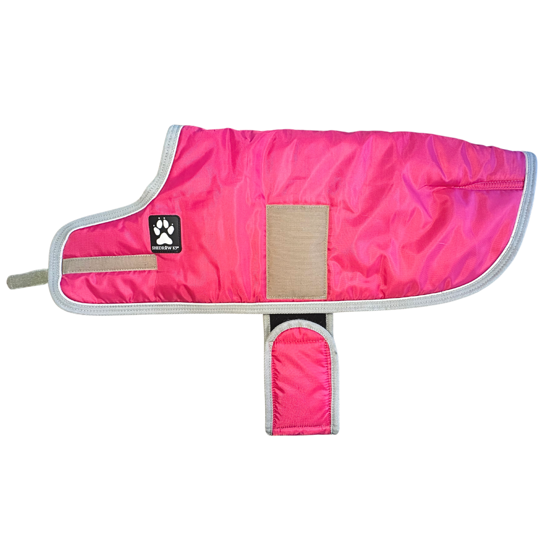 The Shedrow K9 Red Tundra Coat is designed for winter weather, featuring a wind and water-resistant 420 denier outer shell, 200-gram polyfill, and cozy fleece lining. It offers a customizable fit with adjustable chest and belly closures, plus stretchy leg straps to keep the coat in place. Reflective piping enhances visibility during nighttime walks.